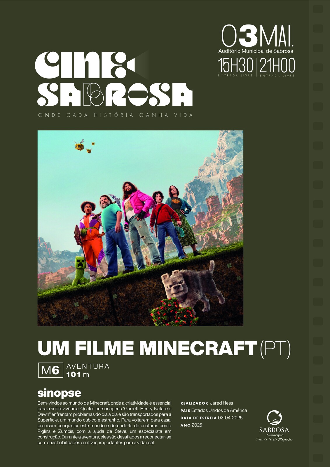 sinopse: Bem-vindos ao mundo de Minecraft, onde a criatividade não só ajuda a construir mas é essencial para a sobrevivência! Quatro desenquadrados — Garrett “O Homem do Lixo” Garrison (Momoa), Henry (Hansen), Natalie (Myers) e Dawn (Brooks) — debatem-se com problemas do quotidiano quando são repentinamente transportados através de um portal misterioso para a Superfície: um mundo cúbico e bizarro que vive da imaginação. Para voltarem para casa, terão de conquistar este mundo (e protegê-lo de criaturas maléficas como Piglins e Zumbis) enquanto embarcam numa missão mágica com um especialista inesperado em construção, Steve (Black). Juntos, a sua aventura desafiará os cinco a serem audaciosos e a reconectar-se com as qualidades que tornam cada um deles criativo… as mesmas habilidades que precisam para prosperar no mundo real. A primeira adaptação em imagem real do videojogo popular Minecraft para o grande ecrã.