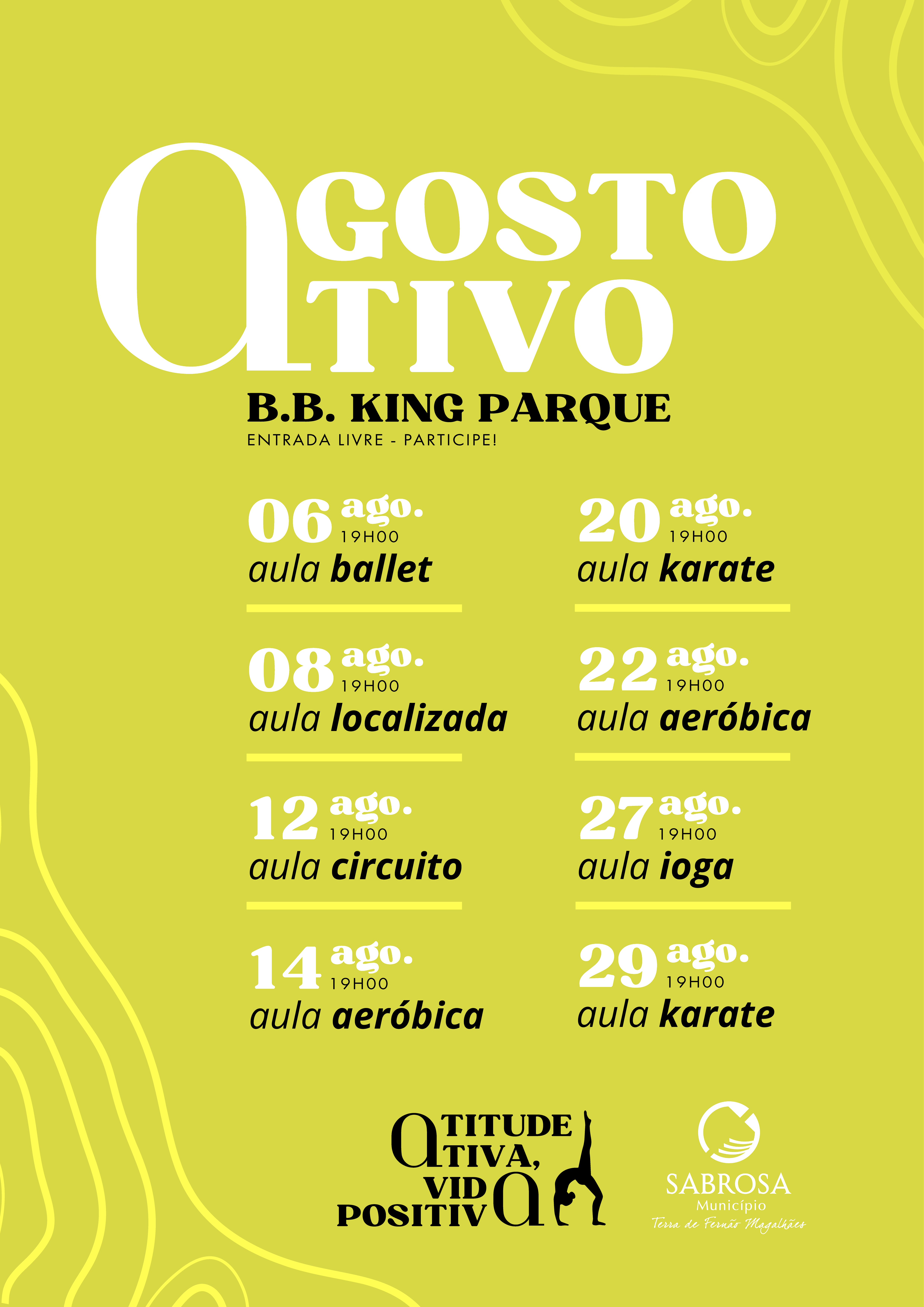 O município de Sabrosa apresenta 𝘼𝙂𝙊𝙎𝙏𝙊 𝘼𝙏𝙄𝙑𝙊, uma iniciativa de entrada livre que oferece uma variedade de atividades físicas durante todo o mês, no BB King Parque. Com o objetivo de promover a saúde e o bem-estar da comunidade, todos são convidados a participar e desfrutar de um mês repleto de movimento e diversão ao ar livre.
