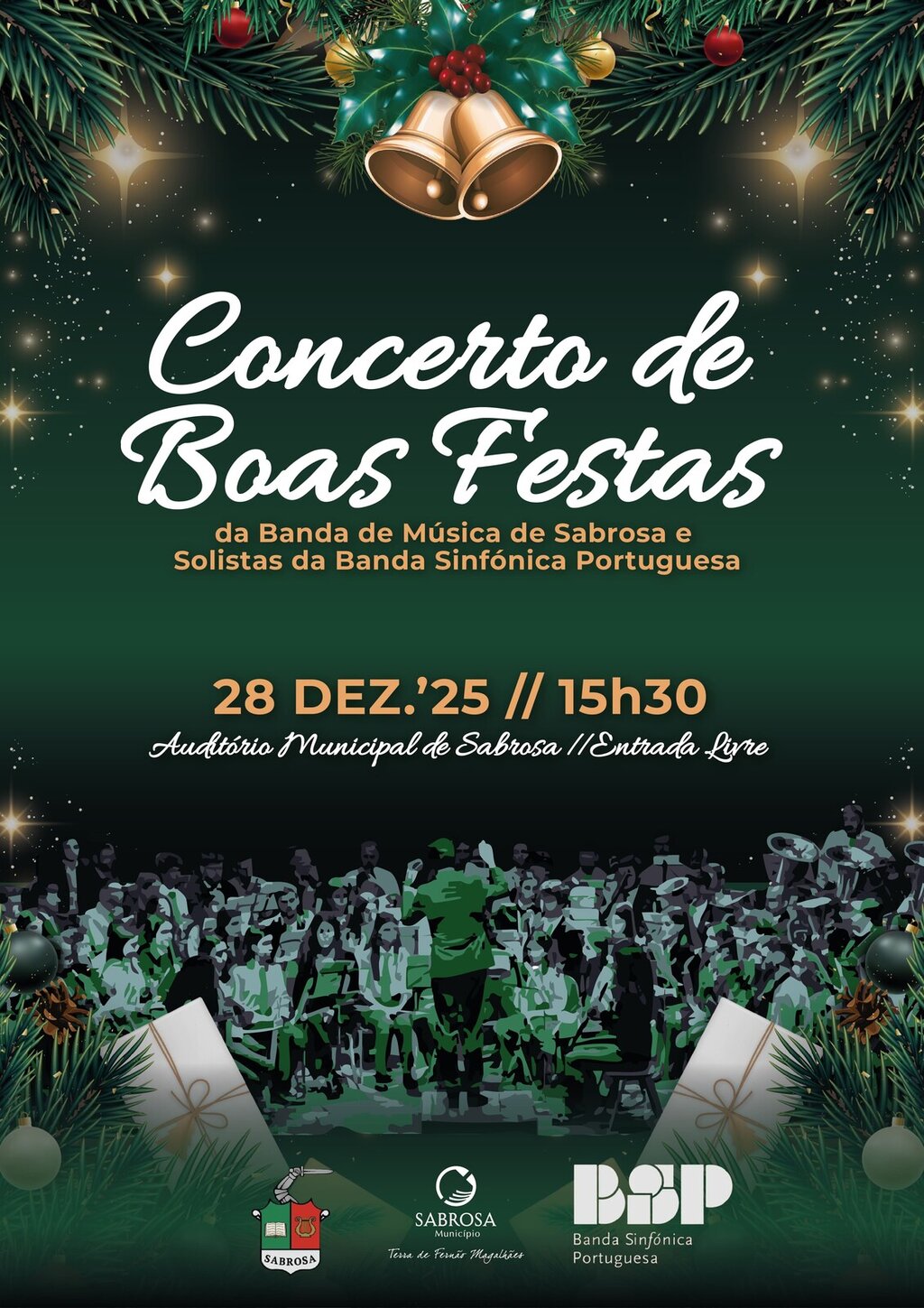 𝟮𝟴 𝗗𝗘𝗭𝗘𝗠𝗕𝗥𝗢 (𝟭𝟱𝗛𝟯𝟬) | CONCERTO DE BOAS FESTAS PELA BANDA DE MÚSICA DE SABROSA E SOLISTAS DA BANDA SINFÓNICA PORTUGUESA (𝘰𝘳𝘨.: Banda de Música de Sabrosa com o apoio do Município) | Auditório Municipal de Sabrosa