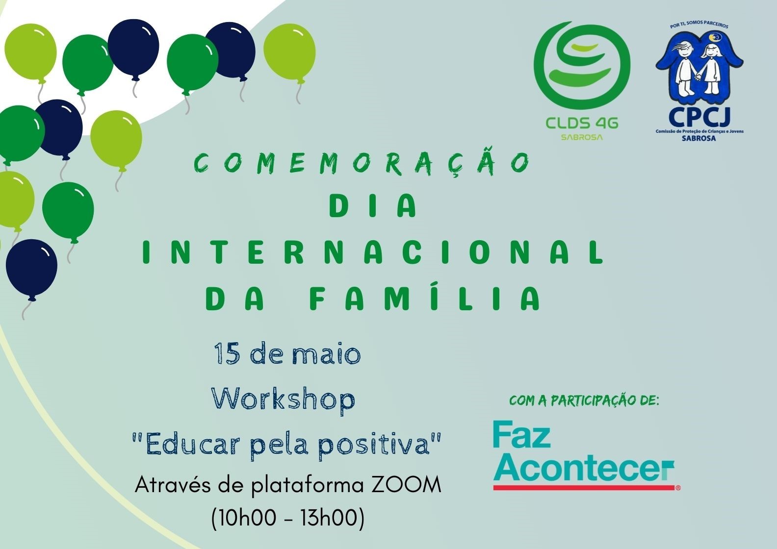 workshop “Educar pela positiva”, que conta com a participação daempresa “Faz Acontecer”. Direcionado aos adultos da família, os participantes irão conhecer os princípios da educação positiva e o seu impacto diferenciador no desenvolvimento infantil e na aprendizagem, potenciar a sua resposta perante problemáticas decorrentes na educação , explorar o seu papel no desenvolvimento de uma relação com a criança marcada pela cooperação e respeito mútuo, aprender a diferenciar castigo de consequência e elogiar de reconhecer, e saber aplicar os mesmos, entre outros conteúdos.
