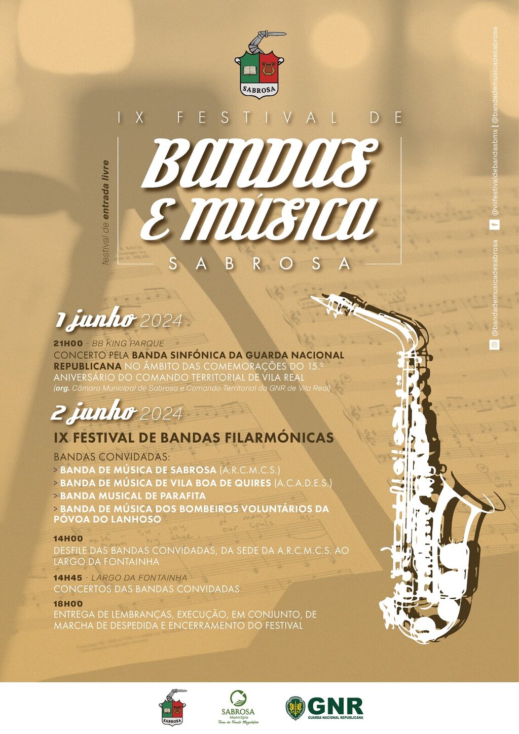 Concerto pela Banda Sinfónica da Guarda Nacional Republicana no âmbito das Comemorações do 15.º Aniversário do Comando Territorial de Vila Real (org. Câmara Municipal de Sabrosa e Comando Territorial da GNR de Vila Real)