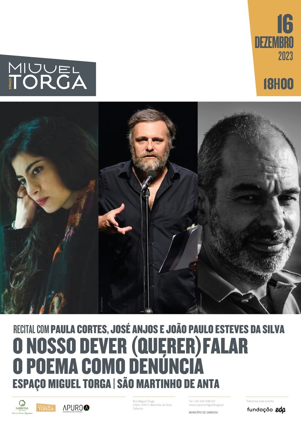 Recital "O nosso dever (querer) falar o poema como denúncia" com Paula Cortes, José Anjos e João Paulo Esteves da Silva no ciclo de poesia Solstícios e Equinócios do Espaço Miguel Torga