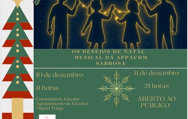 𝟭𝟭 𝗗𝗘𝗭𝗘𝗠𝗕𝗥𝗢 (𝟮𝟭𝗛𝟬𝟬) | ESPETÁCULO SOLIDÁRIO “OS DESEJOS DE NATAL” | Auditório Municipal de Sabrosa (𝘰𝘳𝘨.: APPACDM de Sabrosa com o apoio do Município de Sabrosa)