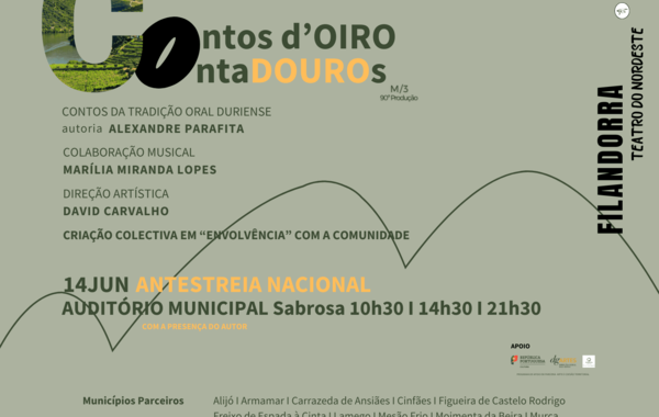 𝟭𝟰 𝗝𝗨𝗡𝗛𝗢 (𝟮𝟭𝗛𝟯𝟬) | 𝘌𝘚𝘗𝘌𝘛𝘈́𝘊𝘜𝘓𝘖 𝘋𝘌 𝘈𝘕𝘛𝘌𝘚𝘛𝘙𝘌𝘐𝘈 𝘕𝘈𝘊𝘐𝘖𝘕𝘈𝘓 / "𝗖𝗼𝗻𝘁𝗼𝘀 𝗱´𝗢𝗜𝗥𝗢…𝗖𝗼𝗻𝘁𝗮𝗗𝗢𝗨𝗥𝗢𝘀" por Filandorra - Teatro do Nordeste local: Auditório Municipal de Sabrosa