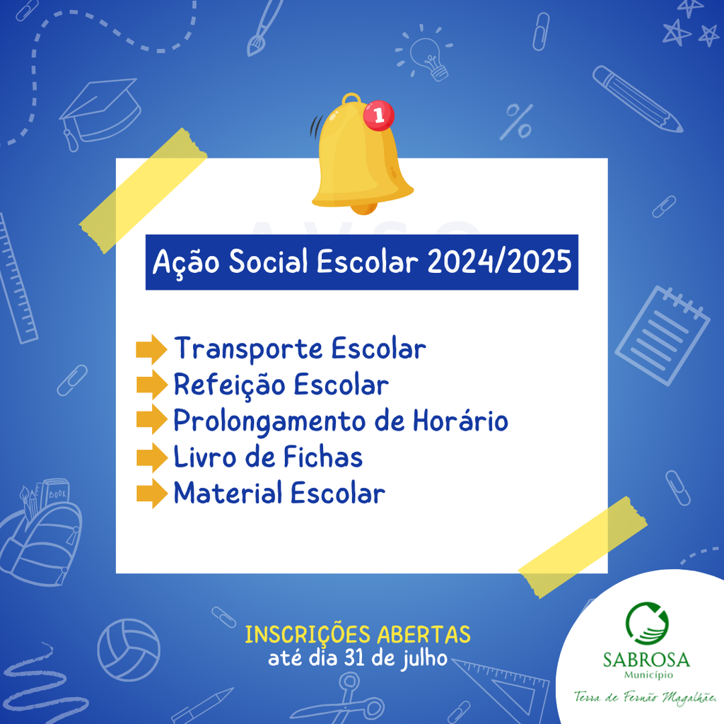 O preenchimento do requerimento para os Apoios da Ação Social Escolar 2024/2025, decorre até ao dia 𝟯𝟭 𝗗𝗘 𝗝𝗨𝗟𝗛𝗢 , para que as crianças tenham acesso aos seguintes serviços: