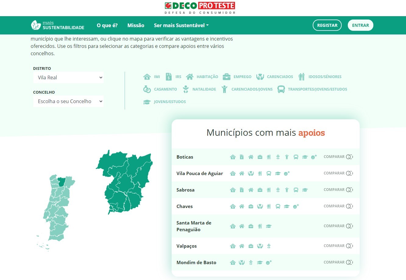 No mapa interativo disponível no site é possível, para além de consultar as vantagens e incentivos oferecidos por todos os concelhos do pais, selecionar as categorias avaliadas, comparando os apoios entre os vários concelhos a nível nacional.