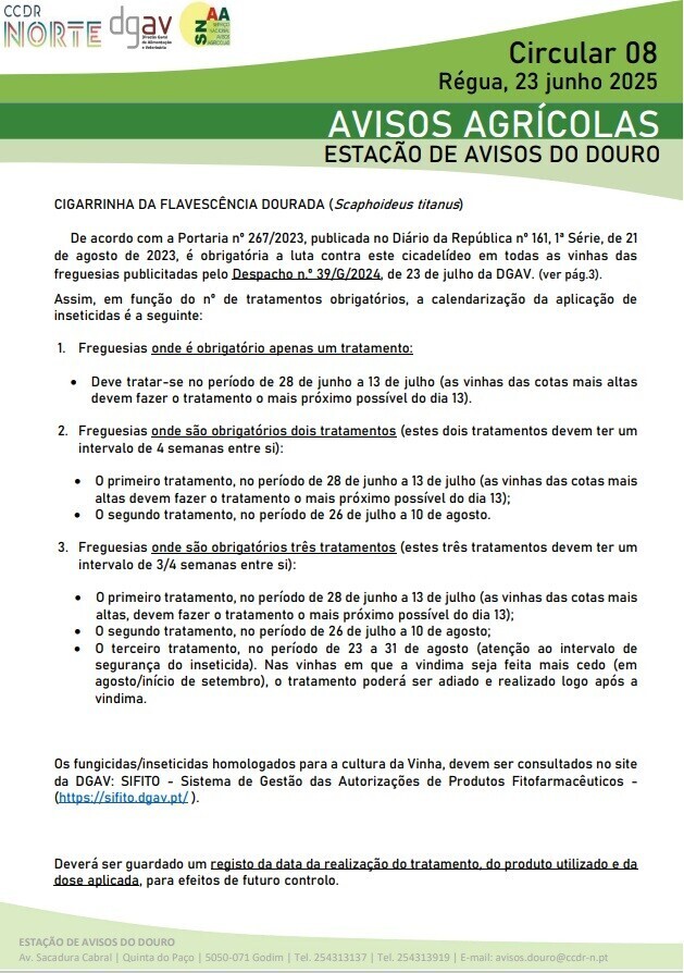 De acordo com a Portaria nº 267/2023, publicada no Diário da República nº 161, 1ª Série, de 21 de agosto de 2023, é obrigatória a luta contra a cigarrinha da flavescência dourada, em todas as vinhas das freguesias publicitadas pelo Despacho n.º 39/G/2024, de 23 de julho da DGAV.