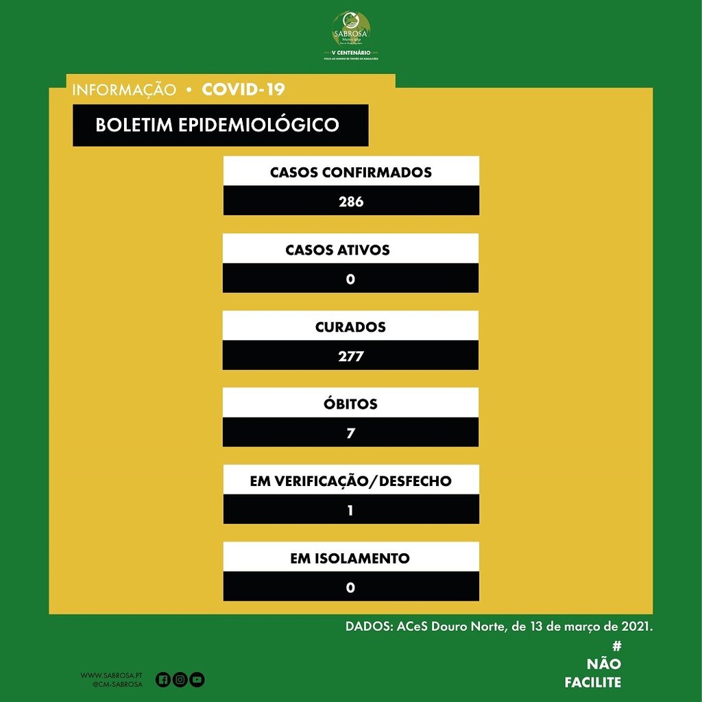 Dados da COVID-19 no Município de Sabrosa a 13 março 2021!