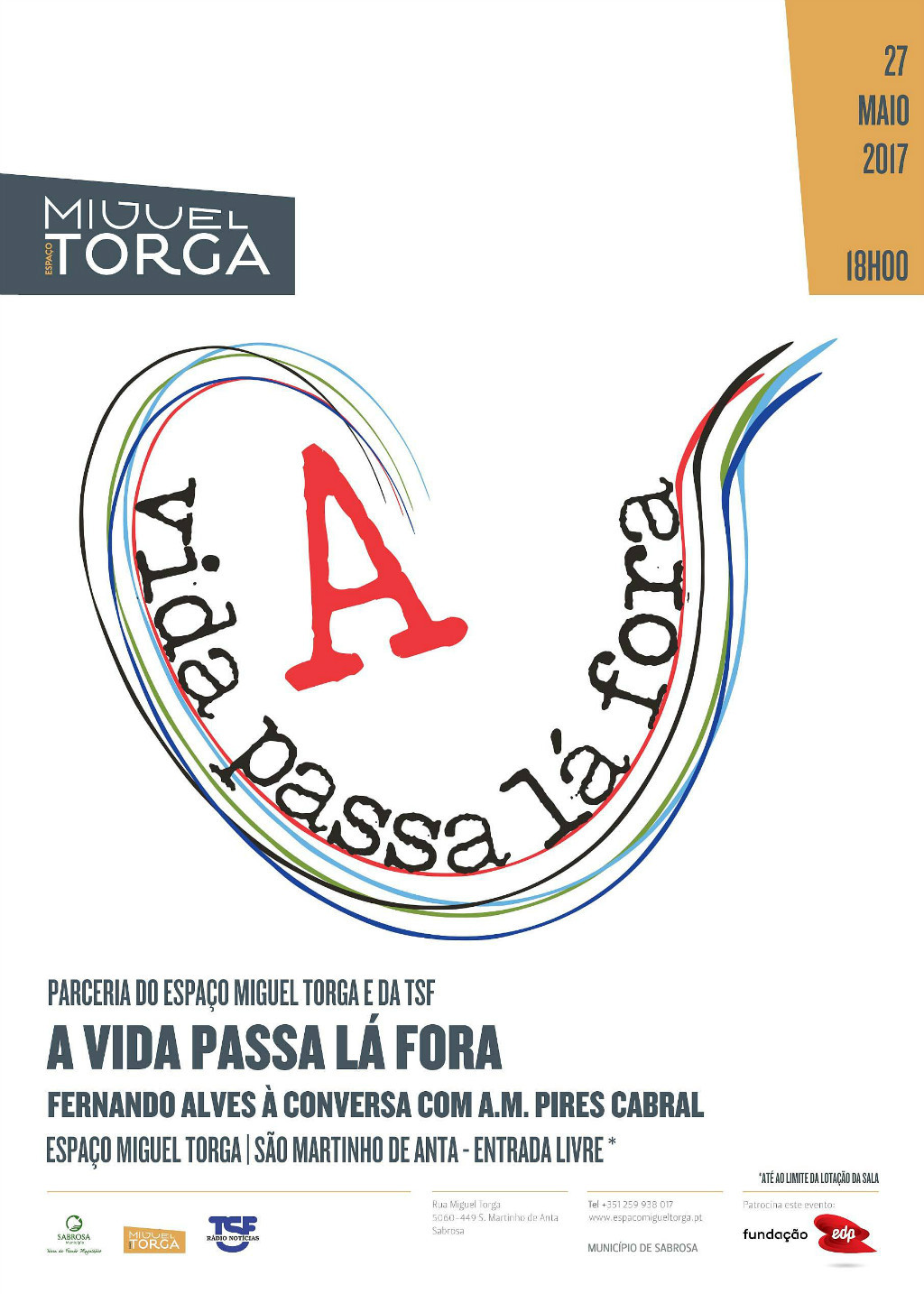 “A Vida Passa Lá Fora” é o mote para um momento imperdível de conversa e tertúlia, no qual participarão o jornalista da TSF Fernando Alves e o escritor A.M. Pires Cabral, a partir das 18h00 do próximo sábado, 27 de maio, no Espaço Miguel Torga em S. Martinho de Anta.