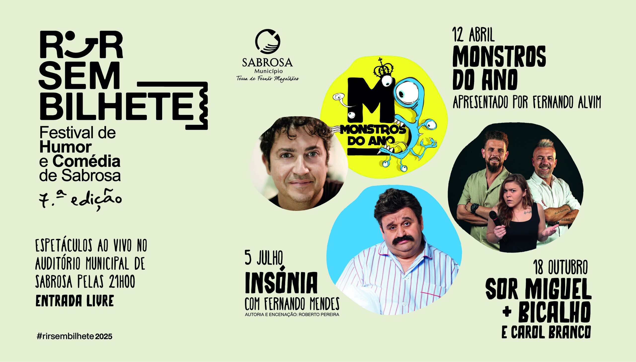 O Festival Rir Sem Bilhete está de volta ao Auditório Municipal de Sabrosa para a sua sétima edição e este ano tem “Fernando Alvim e os Monstros do Ano” e Fernando Mendes - com a comédia “Insónia” como cabeças de cartaz. O programa deste ano fica completo com o espetáculo de “Sor Miguel, Bicalho e Carol Branco”.