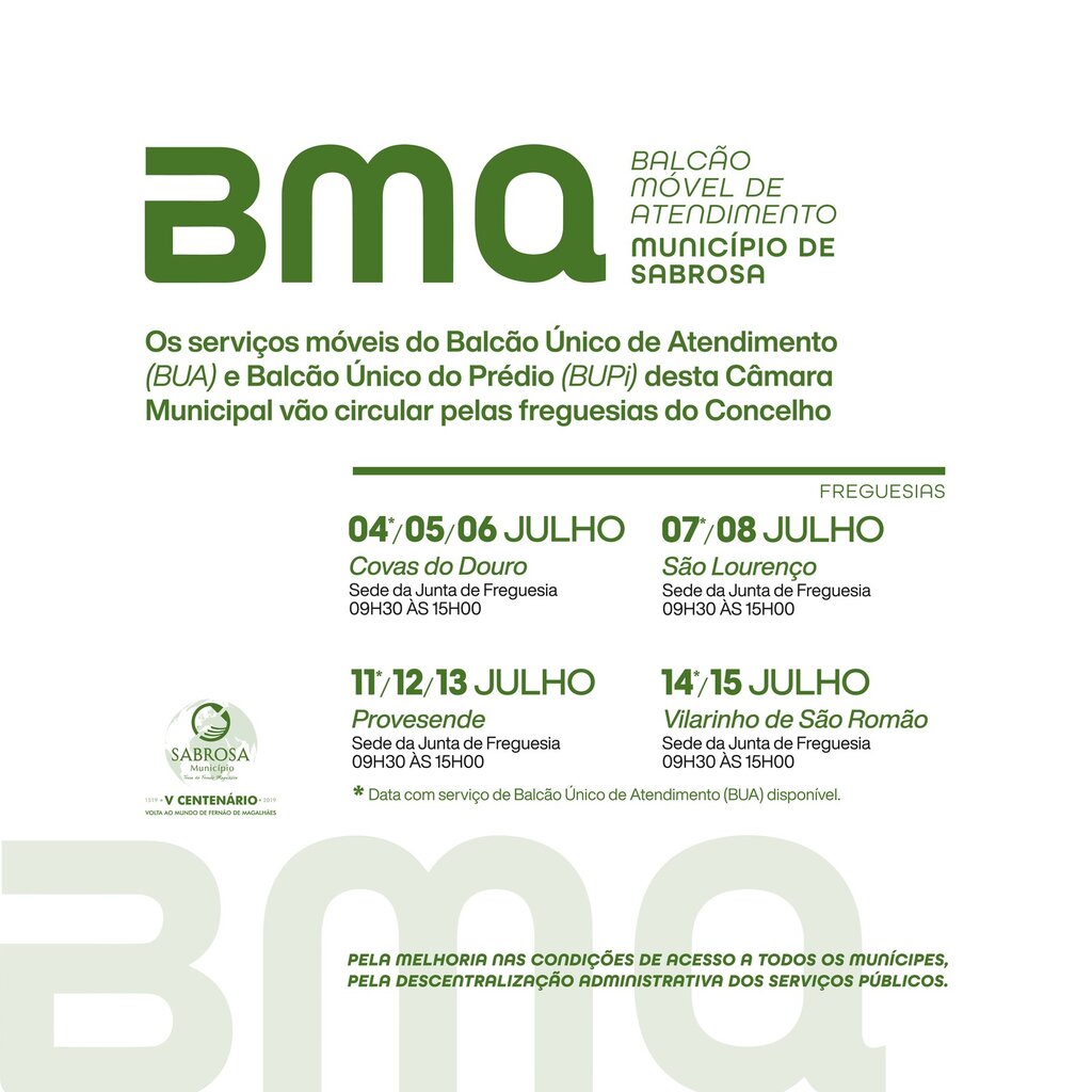 É de referir que o serviço BUA (Balcão Único de Atendimento) estará disponível apenas no primeiro dia das datas de cada freguesia, sendo que o serviço BUPi (Balcão Único do Prédio) se prolonga pelas datas anunciadas.