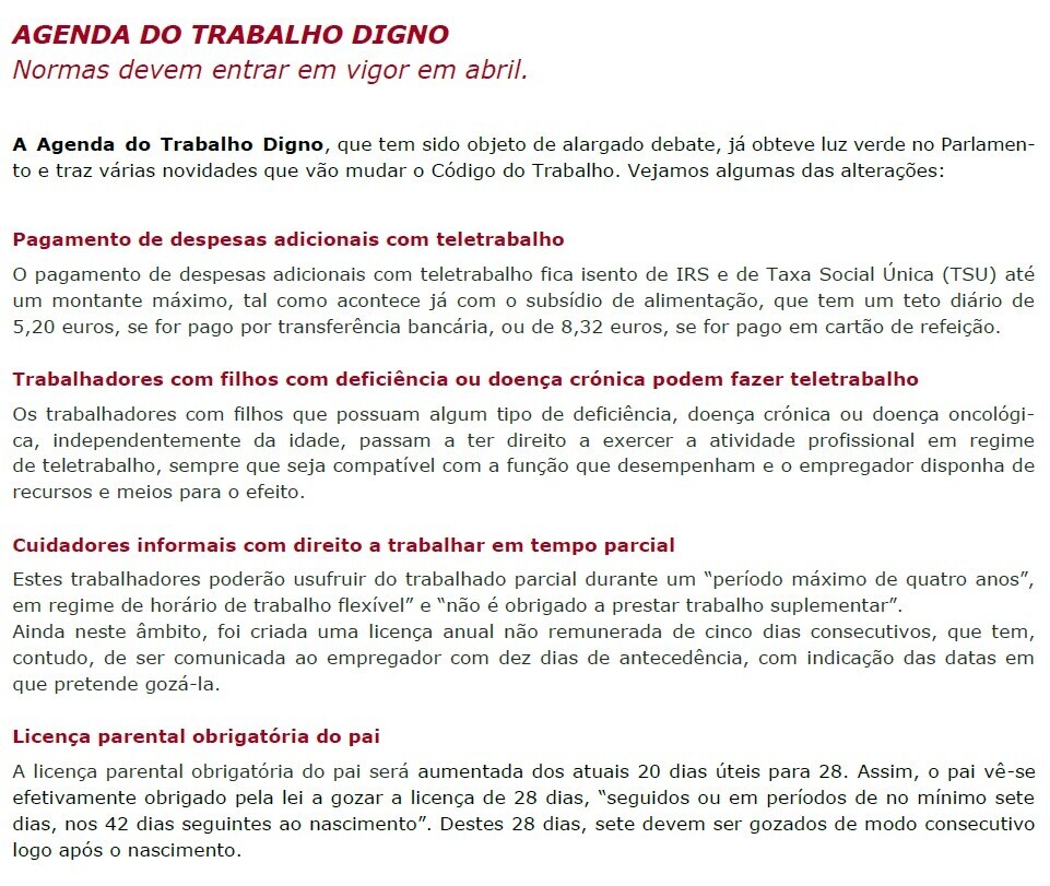 - AGENDA DO TRABALHO DIGNO - NORMAS DEVEM ENTRAR EM VIGOR EM ABRIL: A Agenda do Trabalho Digno, que tem sido objeto de alargado debate, já obteve luz verde no Parlamento e traz várias novidades que vão mudar o Código do Trabalho.