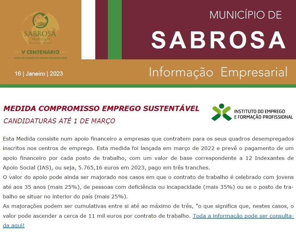 - Medida compromisso emprego sustentável - Candidaturas até 1 de março;