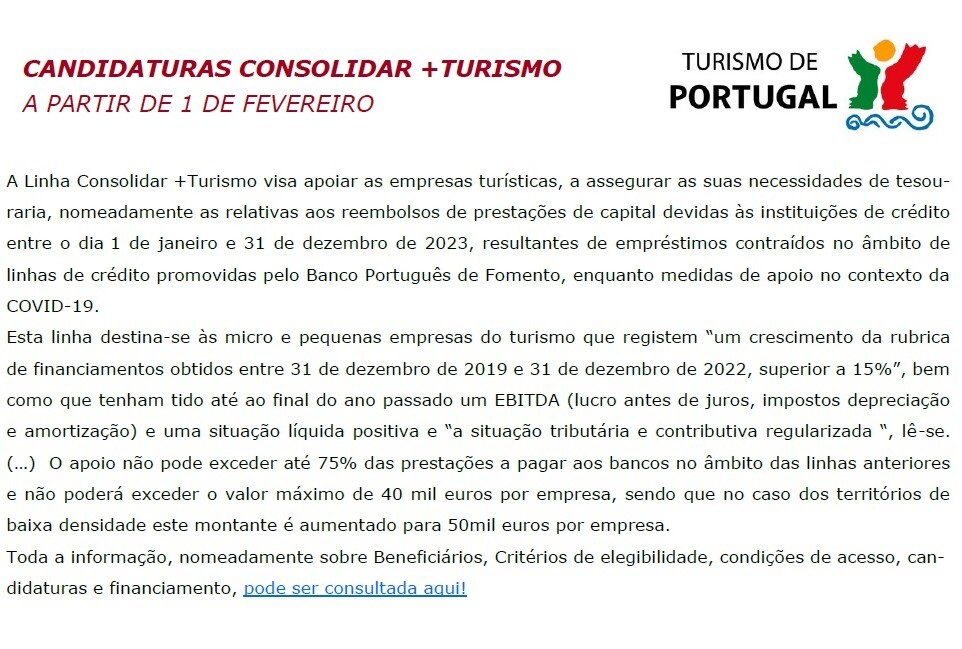 - Candidaturas consolidar +Turismo - A partir de 1 de fevereiro;