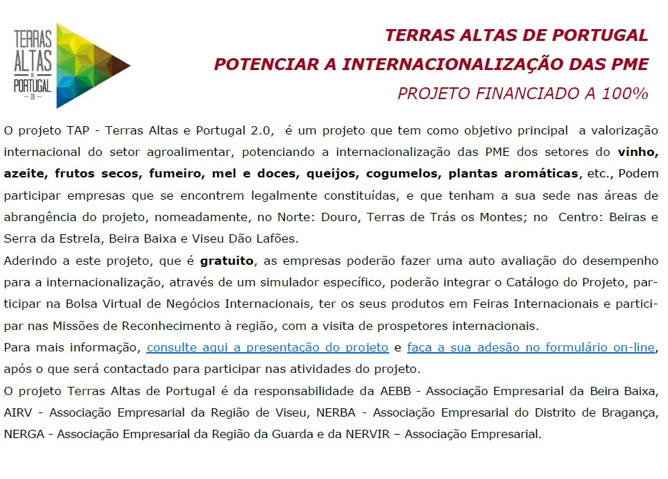 - Terras altas de Portugal - Potenciar a internacionalização das PME - Projeto financiado a 100%;