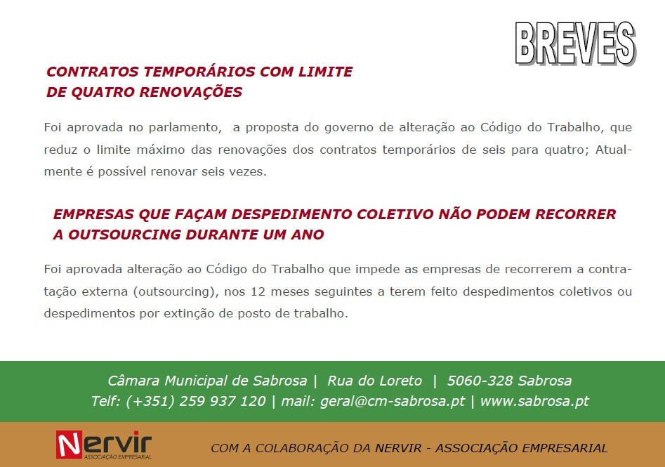 No âmbito da colaboração do Munícipio de Sabrosa com a NERVIR, disponibilizamos informações importantes para a área empresarial: