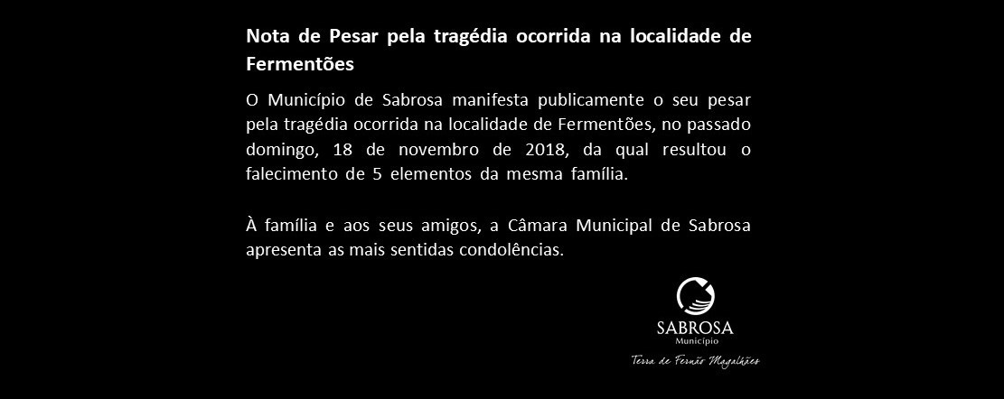 O Município de Sabrosa manifesta publicamente o seu pesar pela tragédia ocorrida na localidade de Fermentões, no passado domingo, 18 de novembro de 2018, da qual resultou o falecimento de 5 elementos da mesma família.