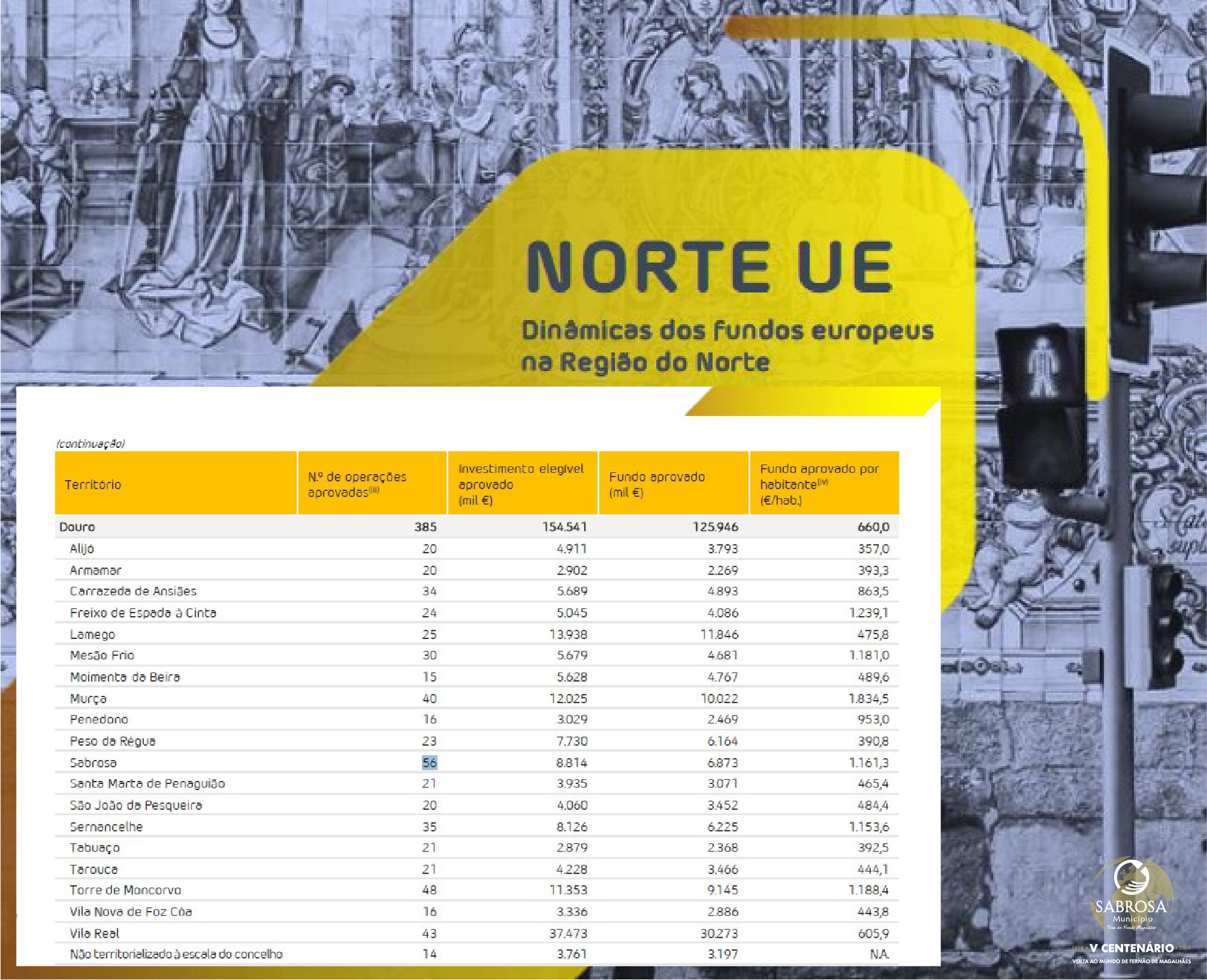 Relativamente aos fundo aprovado e intensidade de fundo aprovado no nosso concelho, Sabrosa apresenta um Investimento elegível aprovado de 8.8 milhões de euros e um fundo aprovado de 6.8 milhões de euros, perfazendo um valor de Fundo aprovado por habitante de 1.161,3€/hab., muito acima da média dos municípios do Douro, que é de 660€ por habitante.