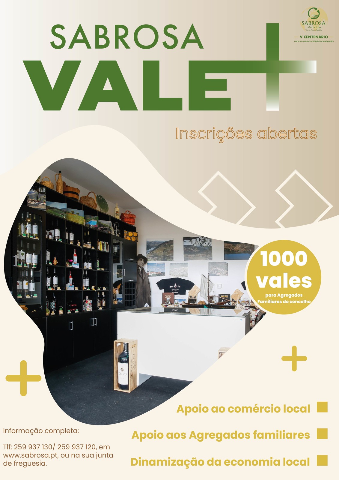 A Camara Municipal de Sabrosa aprovou a medida “Sabrosa Vale+”, de apoio aos agregados familiares e estabelecimentos comerciais do concelho de Sabrosa, que visa conceder 1000 vales de vinte euros aos agregados familiares para serem gastos nos estabelecimentos comerciais aderentes.